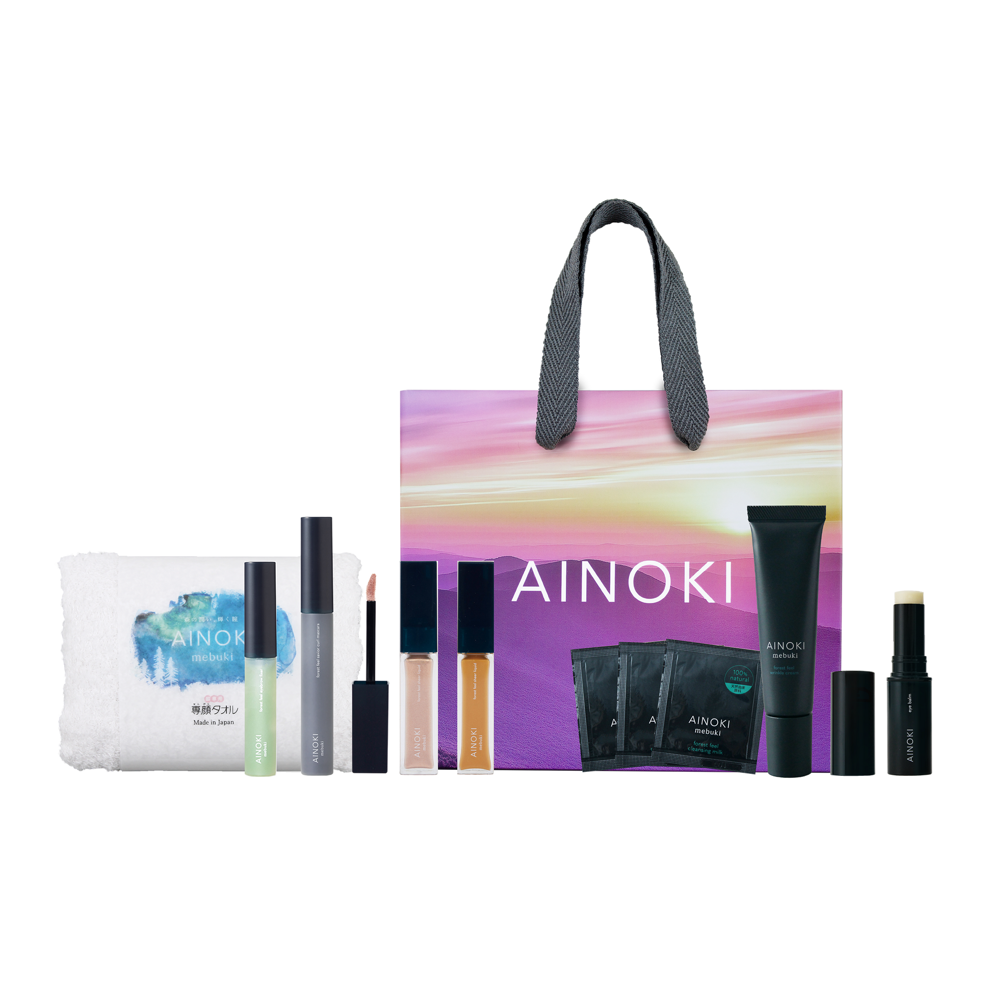 ブランド1番人気の「シアーリキッド 01 木漏れ日」と「セイバーカールマスカラ 01 夜霧」が必ず入ったAINOKI初となる数量限定の福袋です。
